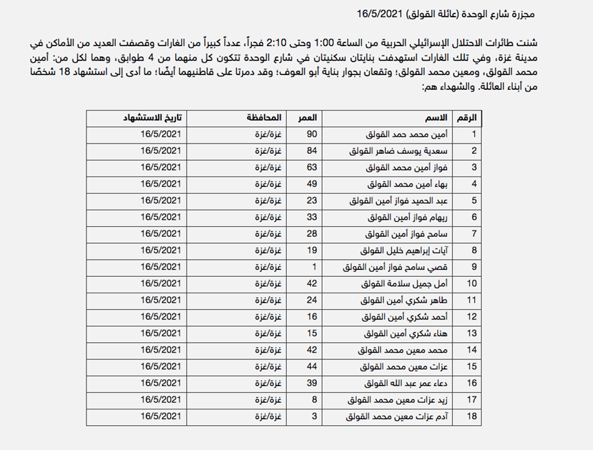 [1](2021, May). The most prominent massacres carried out by the Israeli occupation in the aggression against Gaza in May 2021.WAFA Palestine News and Info Agency. Page last retrieved on July 15, 2024, 10:30 am.